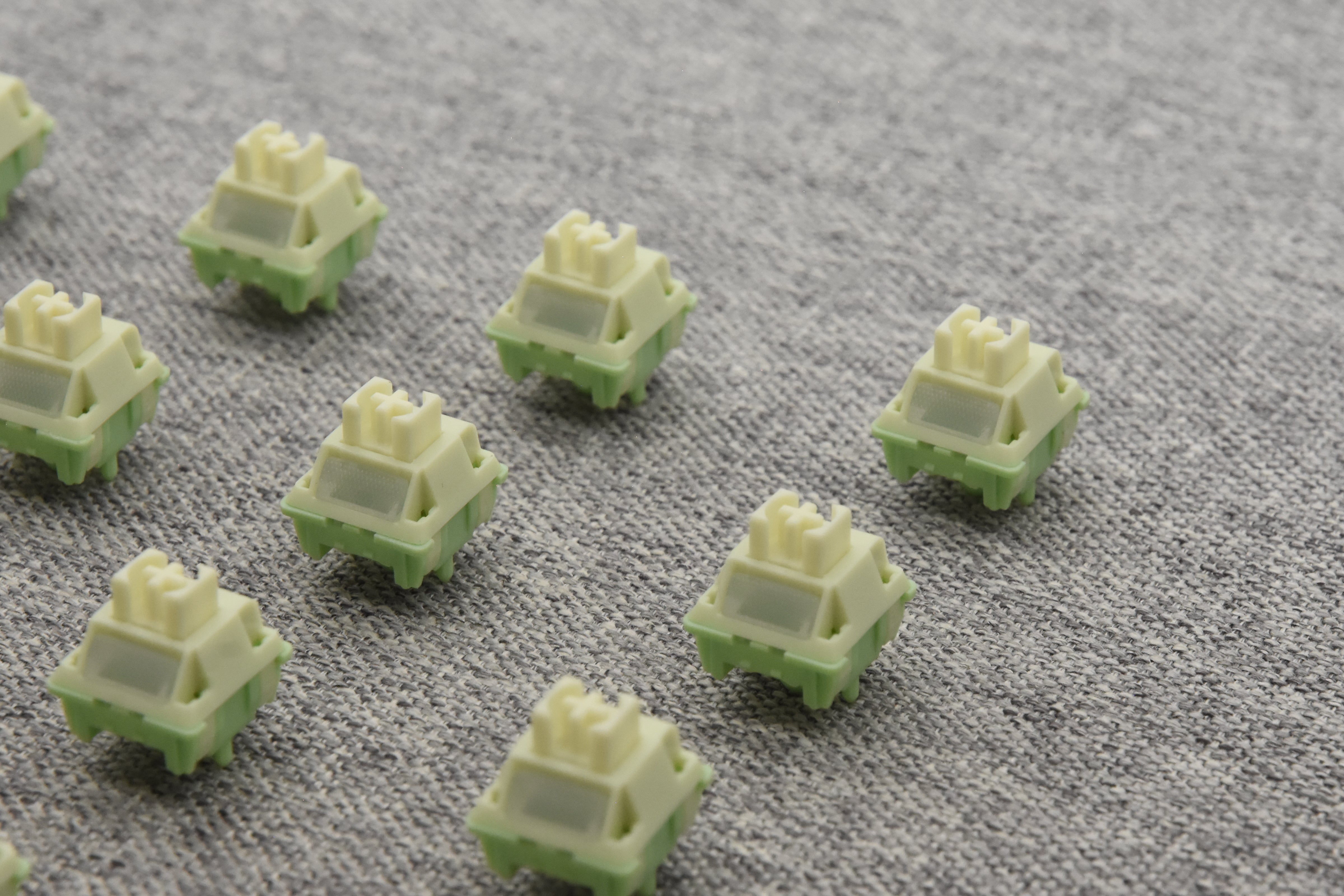 The Milky Green silent switches use stem-dampening legs instead of silicone pads as their silencing mechanism. The advantage of such a mechanism is that a clean bottom-out feel won't need to be sacrificed to trade for its quietness. You can enjoy both a great typing feel and a quiet typing sound at the same time with them Milky Green switches. Factory Lubed: Yes! mixed GPL105&GPL205 on leaf spring, stem feet, and bottom housing rails. Dry film lube on springs